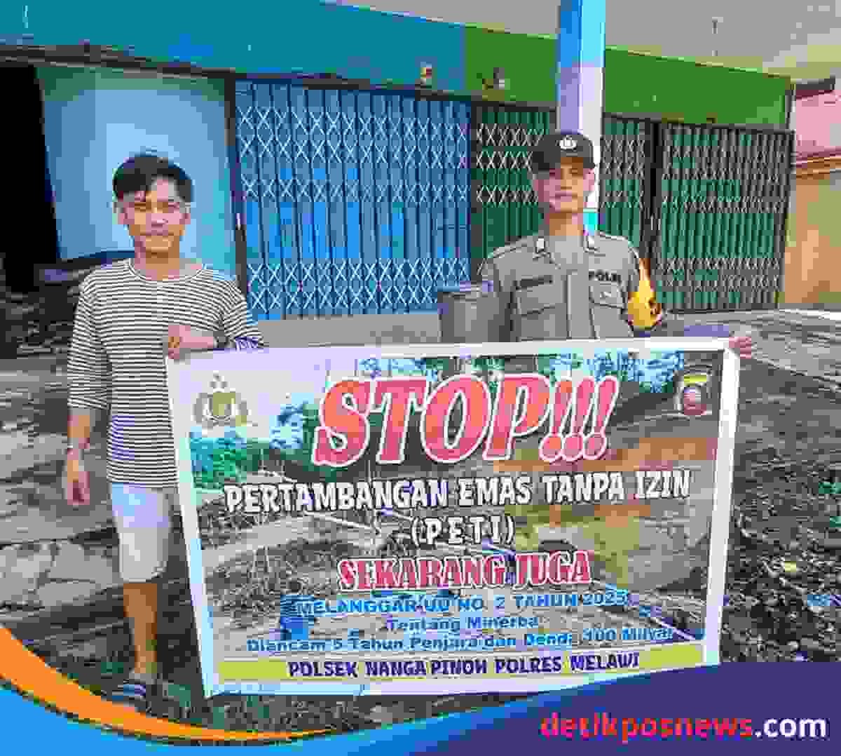Melawi, Kalbar – detikposnews.com | Polsek Nanga Pinoh Polres Melawi Polda Kalbar – Memastikan langkah Polri dalam mencegah aktivitas Pertambangan Emas Tanpa Ijin (PETI), Polsek Nanga Pinoh melakukan sosialisasi langsung kepada masyarakat dengan media spanduk.