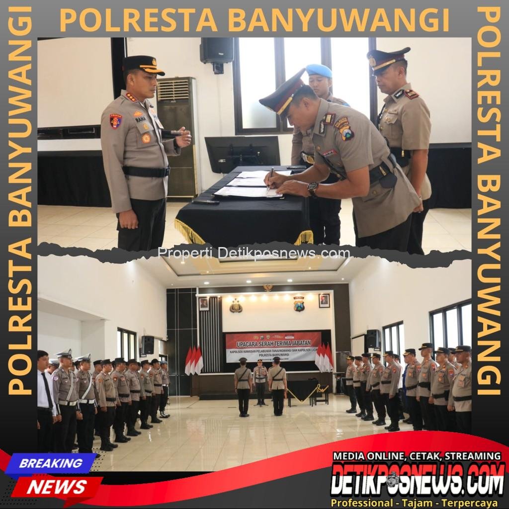 Banyuwangi – Detikposnews.com // Suasana penuh khidmat mewarnai pelaksanaan upacara serah terima jabatan (sertijab) sejumlah Kapolsek jajaran Polresta Banyuwangi yang digelar pada Kamis pagi (13/11/2025) di Gedung Rupatama Wira Pratama Polresta Banyuwangi.