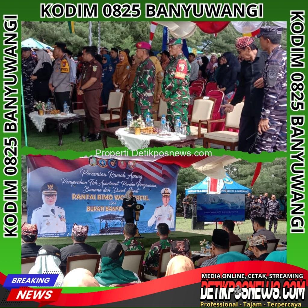 Wongsorejo – Detikposnews.com // Suasana Pantai Bimo di Dusun Bimo, Desa Bimorejo, Kecamatan Wongsorejo, Banyuwangi, pada Selasa (18/11/2025) pagi berubah menjadi pusat perhatian. Sekitar 300 warga dan tamu undangan memadati lokasi untuk menyaksikan peresmian Rumah Apung serta penyerahan fish apartment, banana boat, dan donut boat oleh Bupati Banyuwangi, Ipuk Fiestiandani. Kegiatan ini menjadi bagian dari upaya pengembangan wisata bahari sekaligus peningkatan ekonomi masyarakat pesisir.