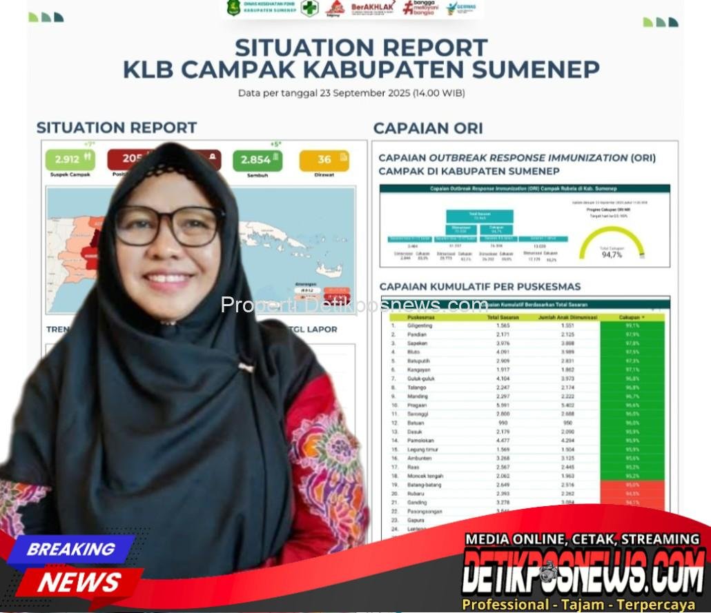 SUMENEP – Detilkposnews.com // Dinas Kesehatan, Pengendalian Penduduk dan Keluarga Berencana (DKP2KB) Kabupaten Sumenep intensifkan pelaksanaan Outbreak Response Immunization (ORI) Campak Rubela (MR), melalui 26 Puskesmas di wilayah Kabupaten Sumenep hingga hari ke-25. Selasa (23/09/2025)