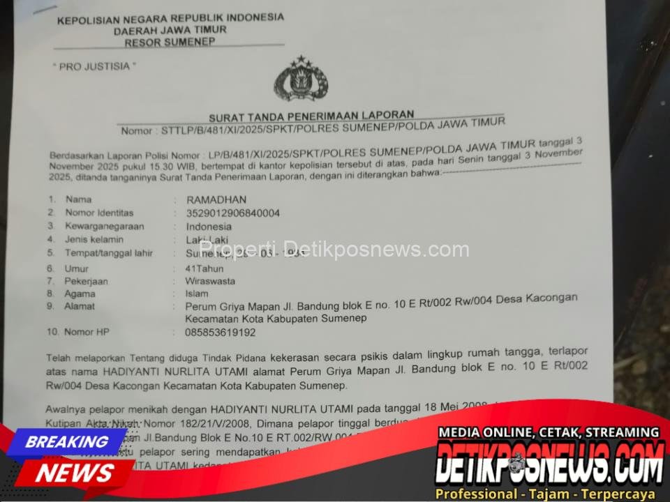 SUMENEP-Detikposnews.com// Dugaan Kasus Kekerasan Dalam Rumah Tangga (KDRT) kembali terjadi di wilayah Kabupaten Sumenep yang berujung pelaporan. Seorang pria berinisial RM (41), warga Perumahan Griya Mapan, Desa Kacongan, Kecamatan Kota Sumenep, resmi melaporkan istrinya LT ke Polres Sumenep atas dugaan tindak Kekerasan Dalam Rumah Tangga (KDRT) yang berdampak buruk terhadap psikis RM dan anaknya. Senin (03/11/2025)