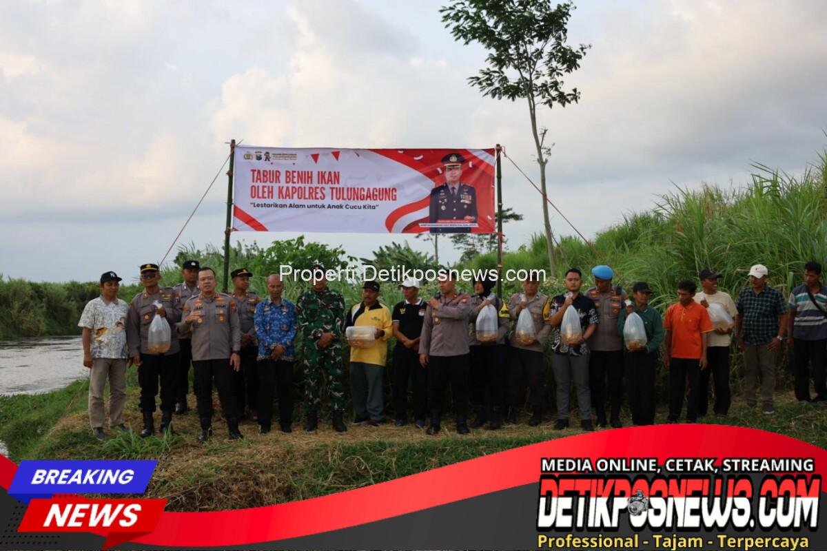 TULUNGAGUNG – Detikposnews.com // Dalam rangka menjaga kelestarian ekosistem sungai sekaligus mendukung ketahanan pangan masyarakat, Kapolres Tulungagung AKBP Muhammad Taat Resdi memimpin kegiatan penaburan benih ikan tombro di bantaran Sungai Ngrowo atau Sungai Parit Agung di Desa Kendalbulur, Kecamatan Boyolangu, Kabupaten Tulungagung, Jumat (17/10/2025).