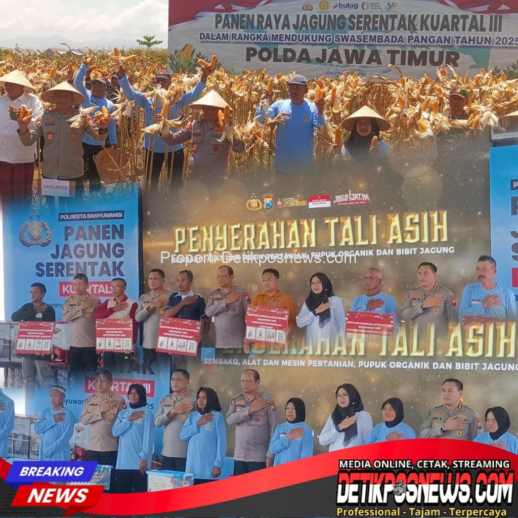 BANYUWANGI – Detikposnews.com // Polresta Banyuwangi menggelar panen jagung serentak kuartal ketiga tahun 2025, bertempat kegiatan di area persawahan Kelurahan Sobo, Kecamatan Banyuwangi, Sabtu (27/9/2025) pagi. Kegiatan ini dihadiri langsung Kapolda Jawa Timur, Irjen Pol. Nanang Avianto, beserta jajaran, Bupati Banyuwangi Ipuk Fiestiandani, serta Kepala Dinas terkait serta para undangan, sekaligus penyerahan bantuan bibit jagung dan mesin pertanian kepada para petani binaan.