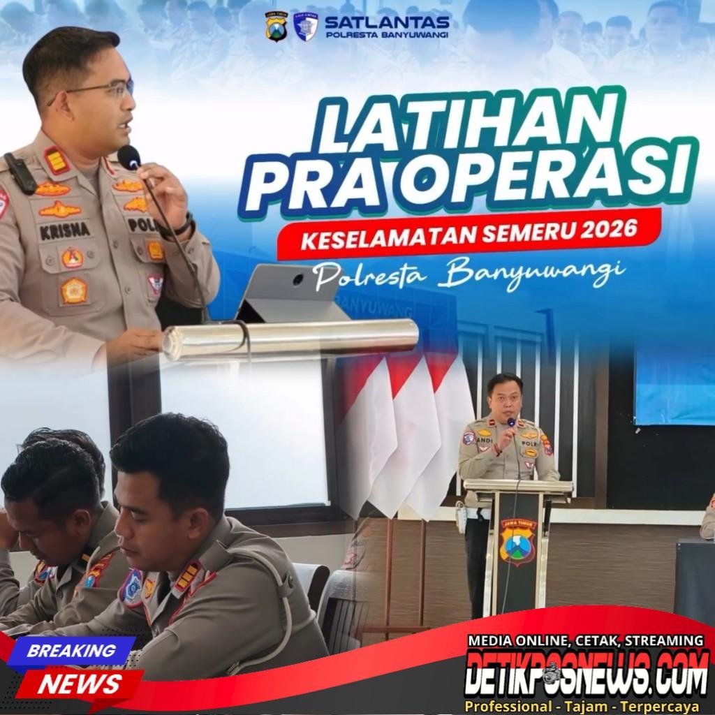 Banyuwangi – Detikposnews.com // Satuan Lalu Lintas (Satlantas) Polresta Banyuwangi turut ambil bagian dalam kegiatan Latihan Pra Operasi (Latpraops) Keselamatan Semeru 2026 yang digelar di Aula Polresta Banyuwangi, Rabu (28/01/2026). Kegiatan ini dihadiri oleh Kasat Lantas Polresta Banyuwangi, AKP I Gusti Bagus Krisna Fuady, S.I.K., M.A.P., bersama para pejabat utama serta personel yang akan terlibat dalam pelaksanaan operasi.