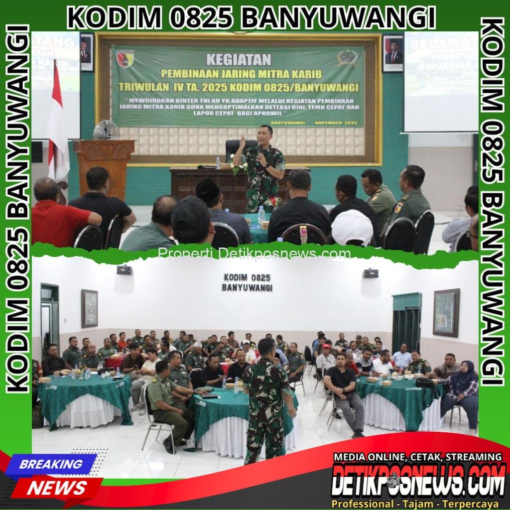 BANYUWANGI — Detikposnews.com // Kodim 0825/Banyuwangi kembali menggelar Pembinaan Jaring Mitra Karib Triwulan IV Tahun 2025, Rabu (03/12/2025), di Aula Makodim Banyuwangi. Kegiatan ini menjadi bagian dari upaya TNI AD memperkuat sistem kewaspadaan wilayah melalui jaringan mitra strategis di tingkat teritorial.