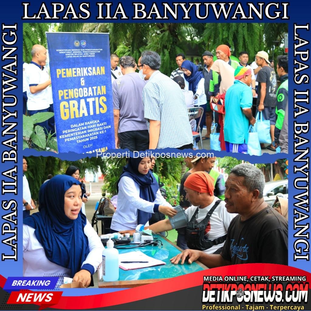 BANYUWANGI – Detikposnews.com // Lembaga Pemasyarakatan (Lapas) Kelas IIA Banyuwangi terus menunjukkan komitmennya untuk memberikan manfaat yang nyata bagi masyarakat luas. Kali ini, komitmen tersebut diwujudkan dengan menyelenggarakan layanan kesehatan gratis bagi warga, yang dilaksanakan di depan Taman Makam Pahlawan (TMP) Wisma Raga Satria, Banyuwangi, Jumat (14/11).