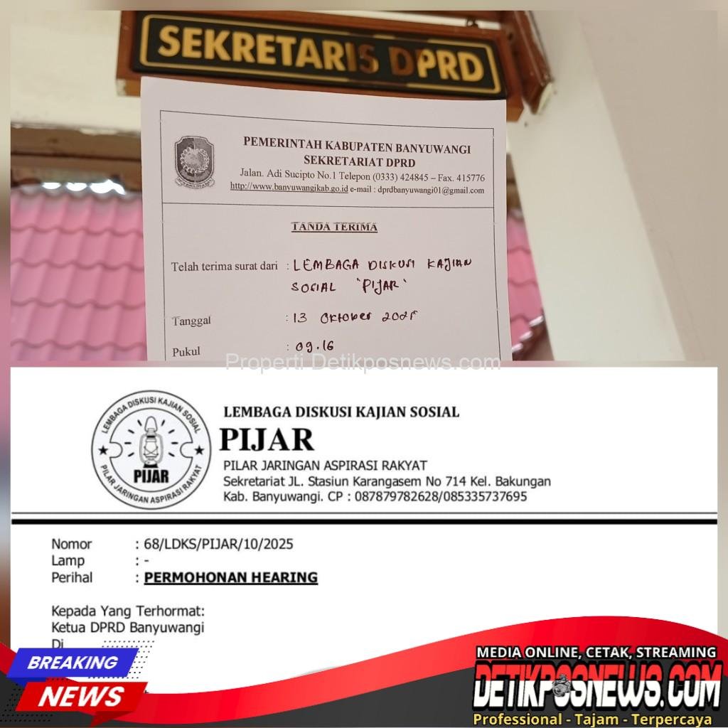 Banyuwangi – Detikposnews.com // Sebagai bentuk keseriusan dalam mengawal isu pencemaran lingkungan yang terindikasi dilakukan oleh PT. Haka Arthacipta Unggul di jalan Karimun Jawa Timur Kelurahan Lateng, Lembaga Diskusi Kajian Sosial (LDKS) Pilar Jaringan Aspirasi Rakyat (PIJAR) mengajukan surat permohonan hearing ke Dewan Perwakilan Rakyat Daerah (DPRD) Banyuwangi.