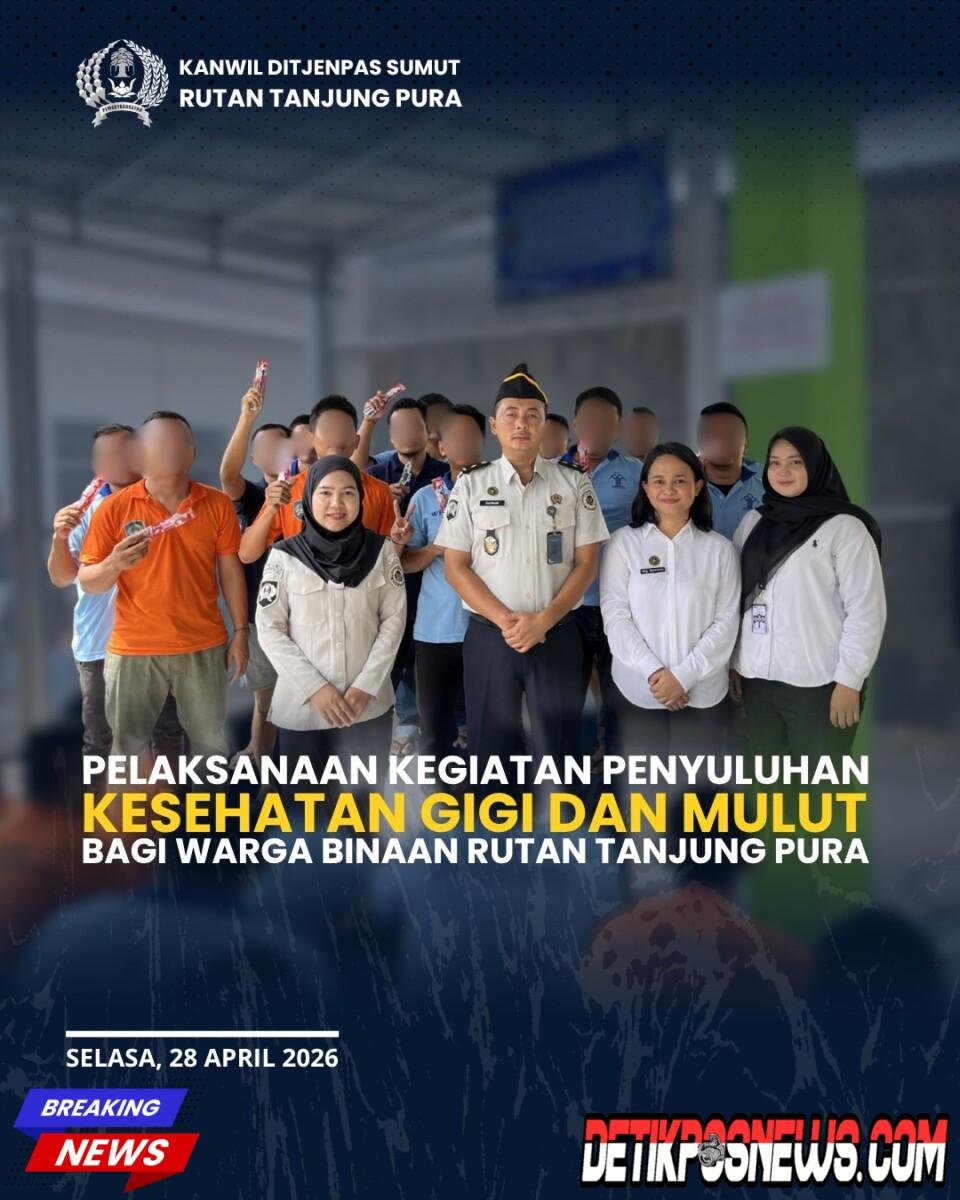 Tanjung Pura – Detikposnews.com // Rumah Tahanan Negara Kelas IIB Tanjung Pura melaksanakan kegiatan penyuluhan kesehatan gigi dan mulut sebagai bagian dari program pelayanan kesehatan bagi warga binaan. Kegiatan ini diselenggarakan sebagai bentuk kepedulian pihak Rutan terhadap kondisi kesehatan seluruh penghuni, mengingat kesehatan gigi dan mulut merupakan salah satu aspek penting yang sering kali kurang mendapat perhatian. Selasa (28/04)