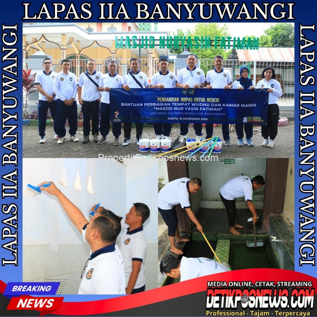 BANYUWANGI – Detikposnews.com // Dalam rangkaian kegiatan memperingati Hari Bakti Kementerian Imigrasi dan Pemasyarakatan (Kemenimipas) Ke-1 Tahun 2025, Lembaga Pemasyarakatan (Lapas) Kelas IIA Banyuwangi turut serta mengimplementasikan program ‘Pengabdian Imipas untuk Negeri’. Program ini diwujudkan melalui kegiatan bakti sosial dengan melakukan perbaikan dan pembersihan fasilitas umum.