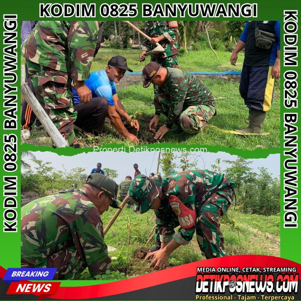 Pesanggaran – Detikposnews.com // Anggota Koramil 0825-11/Pesanggaran melakukan kegiatan gotong royong dan penanaman pohon sukun di pinggir bantaran sungai untuk menjaga kelestarian lingkungan di lokasi Dusun Mulyoasri Desa Sumbermulyo Kecamatan Pesanggaran Kabupaten Banyuwangi, Minggu (16/11/2025).