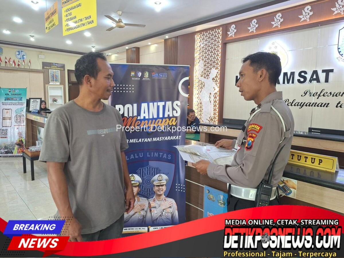 BANYUWANGI – Detikposnews.com // Dalam upaya meningkatkan kualitas pelayanan publik dan mendekatkan diri kepada masyarakat, Satuan Lalu Lintas (Satlantas) Polresta Banyuwangi melaksanakan program inovatif bertajuk “Polantas Menyapa”. Kegiatan ini berlangsung di Kantor Bersama (KB) Samsat Banyuwangi dan disambut antusias oleh masyarakat yang tengah mengurus administrasi kendaraan bermotor.