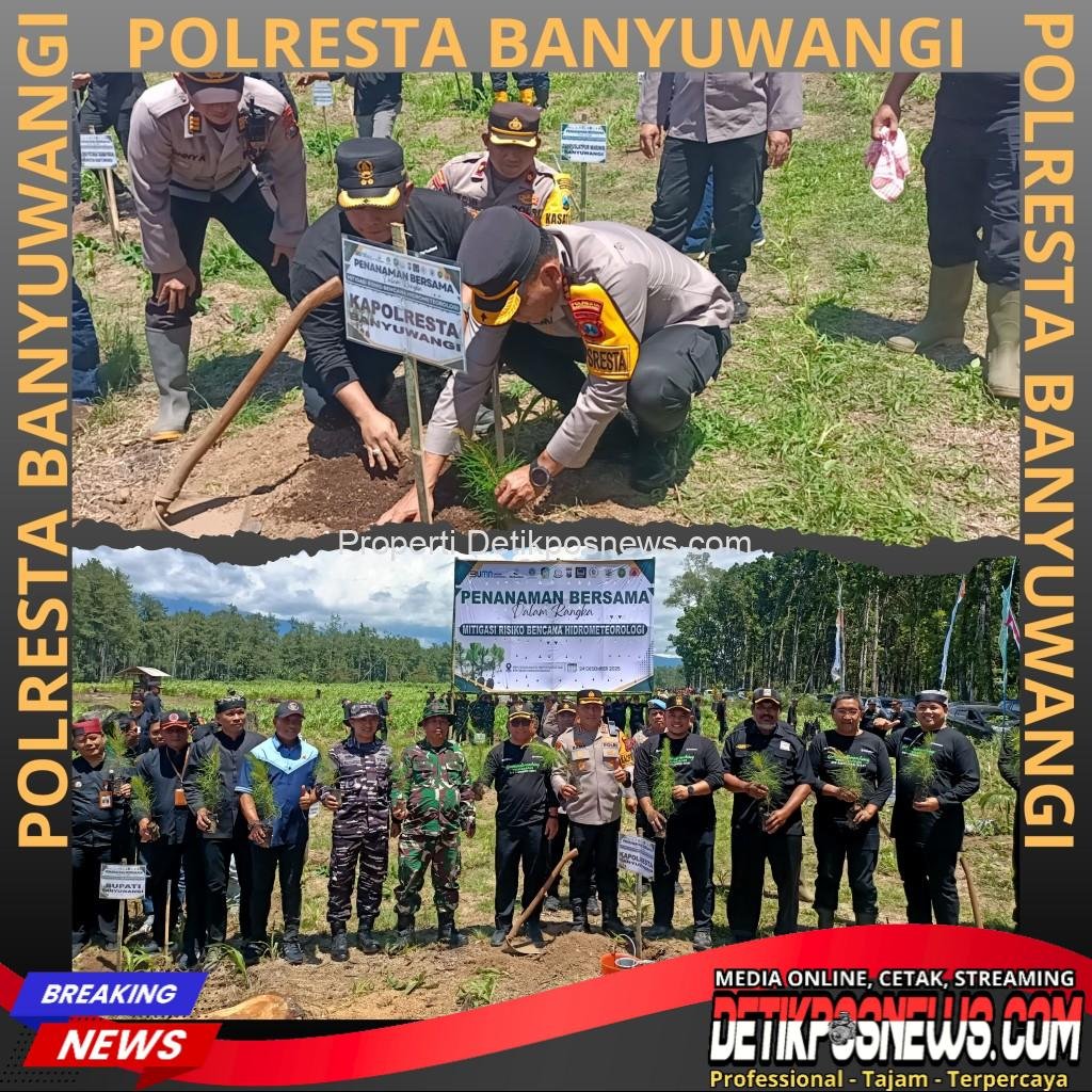 Banyuwangi — Detikposnews.com // Polresta Banyuwangi bersama Pemerintah Kabupaten Banyuwangi dan Perum Perhutani menggelar kegiatan penanaman pohon dalam rangka mitigasi risiko bencana hidrometeorologi, Rabu (24/12/2025). Kegiatan berlangsung di RPH Sidomulyo, BKPH Kalisetail, KPH Banyuwangi Barat.