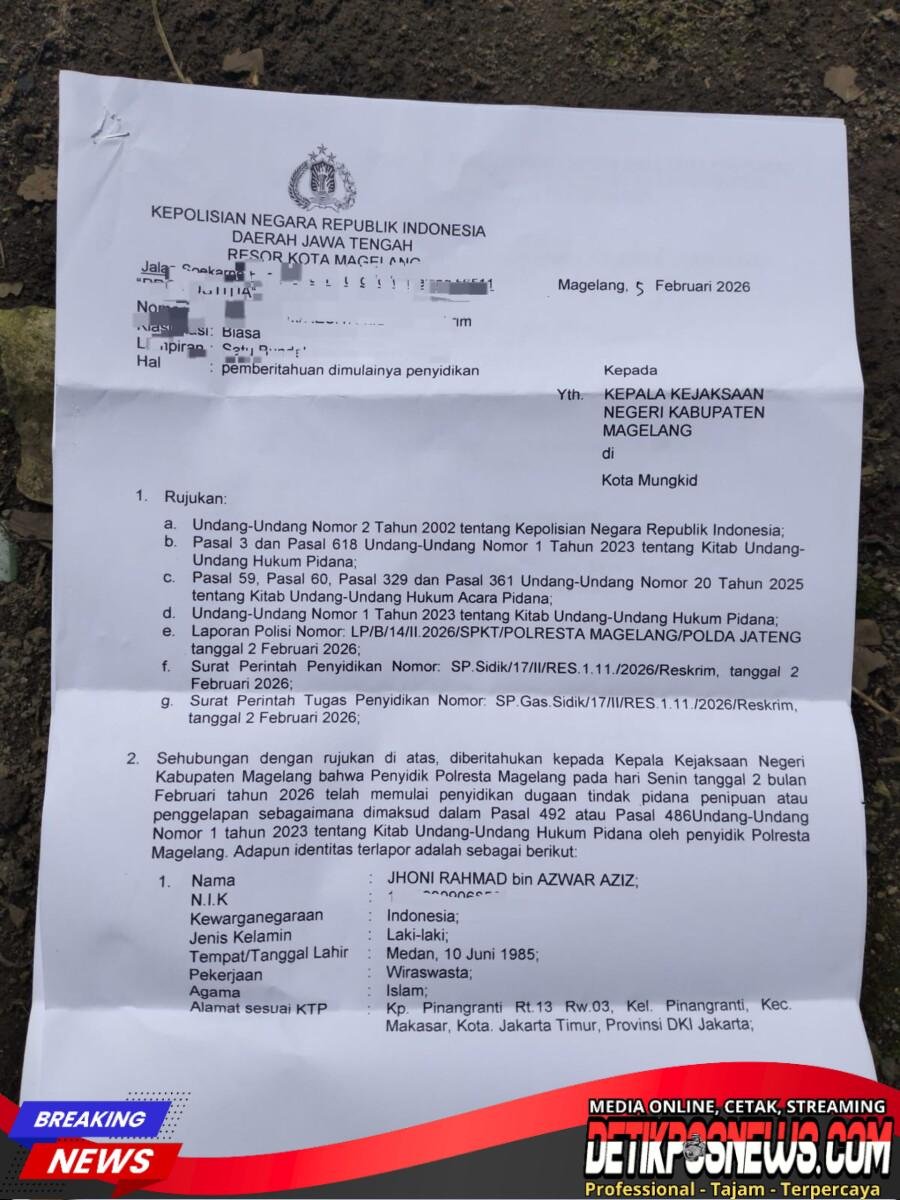 MAGELANG – Detikposnews.com // Polresta Magelang Polda Jawa Tengah saat ini tengah mendalami laporan dugaan penipuan dengan modus menjanjikan kelulusan seleksi penerimaan anggota TNI AU. Kasus tersebut mencuat setelah seorang warga yang didampingi Pujiyanto, dikenal dengan sebutan Yanto Petuk’s, Bersama kuasa hukum korban R.Mas MH Agus Rugiarto, S.H atau Agus Flores, melaporkan ke Polresta Magelang diduga korban penipuan hingga mengalami kerugian mencapai ratusan juta rupiah.
