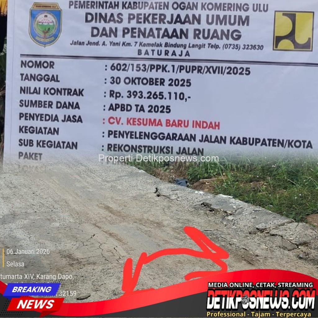 BATURAJA — Detikposnews.com // Proyek pembangunan jalan kabupaten yang dibiayai melalui Anggaran Pendapatan dan Belanja Daerah (APBD) Kabupaten Ogan Komering Ulu (OKU) Tahun Anggaran 2025 menuai sorotan tajam dari masyarakat. Pasalnya, jalan yang berada di wilayah Desa Srimulya, Kecamatan Sinar Peninjauan, Kabupaten OKU, baru rampung dikerjakan sekitar satu pekan lalu, namun kini sudah mengalami kerusakan parah.