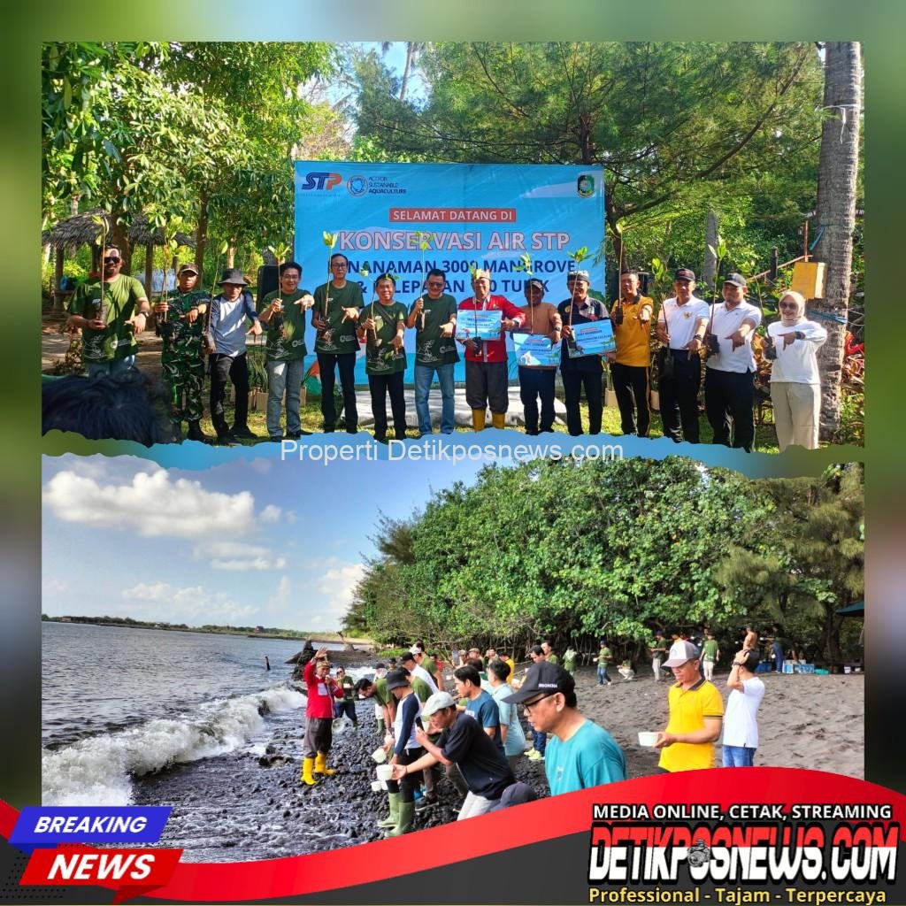 Banyuwangi – Detikposnews.com // Dalam upaya menjaga kelestarian lingkungan pesisir dan ekosistem laut, PT Suri Tani Pemuka (STP) menggelar kegiatan Konservasi Air dengan menanam 3.000 bibit mangrove dan melepas 100 ekor tukik di kawasan Wisata Pantai Cacalan, Kelurahan Klatak, Kecamatan Kalipuro, pada Jumat (17/10/2025) pagi.