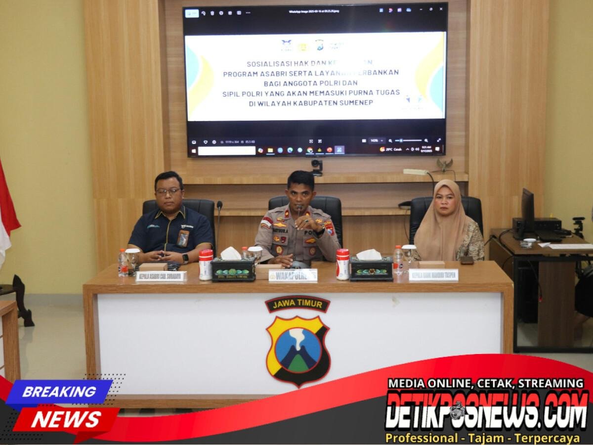 SUMENEP – Detikposnews.com // Wakapolres Sumenep, Kompol Masyur Ade, S.I.K., membuka secara langsung pelaksanaan sosialisasi Hak dan Kewajiban, Program Asabri, serta layanan perbankan bagi anggota Polri dan ASN Polri yang akan memasuki masa purna tugas di wilayah Kabupaten Sumenep. Rabu (17/09/2025)